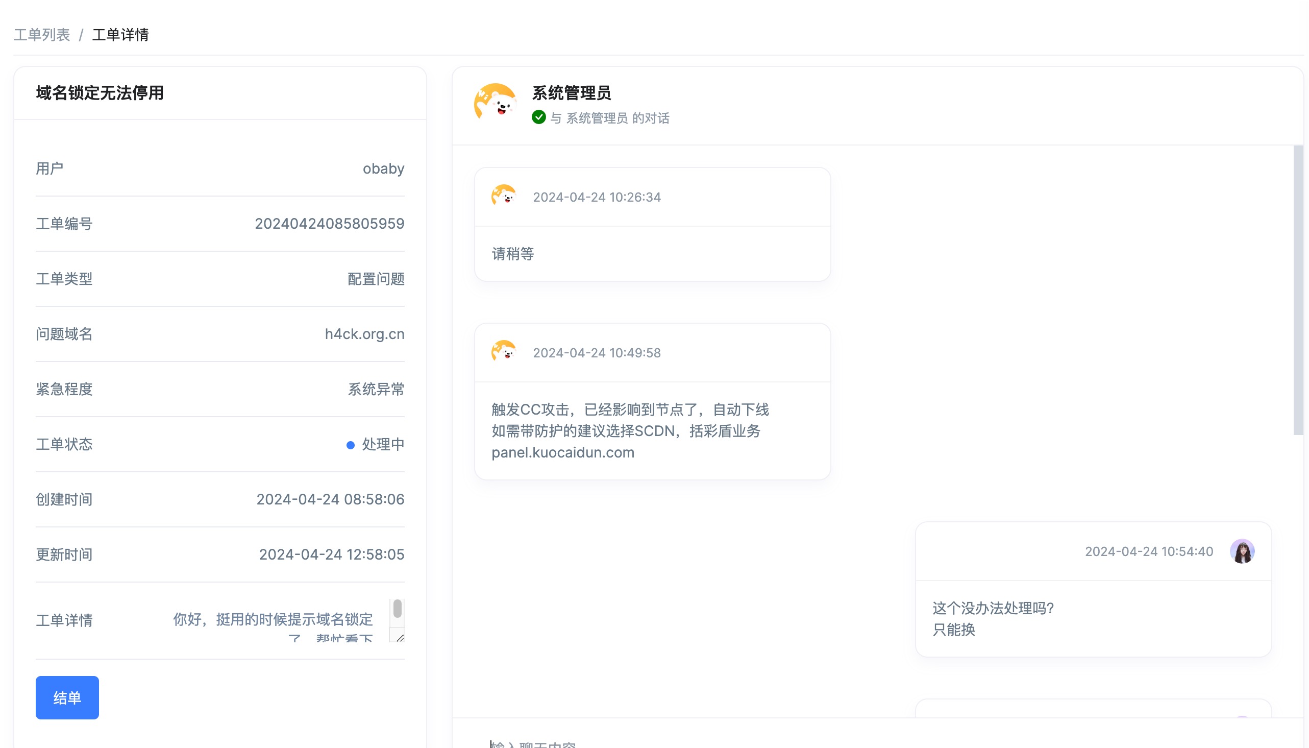 不要反复接入,的确是个问题,看起来一个域名的攻击已经影响到cdn 节点了,那么不让接入自然是最简单的办法了。上午创建工单的时候顺便问了下访问日志的情况,无畏也给提供了,3.84g 的文件,现在没流量也不想下载了,至于分析,也没什么兴趣了。就先酱紫把。